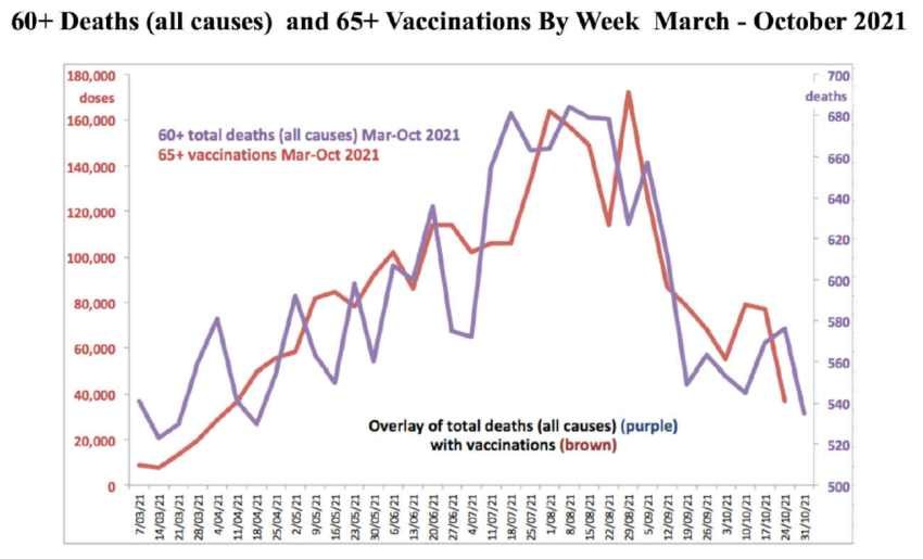 population vaccinated and deaths per million during the last seven days. There is no significant correlation (+0.034)…..I believe this points to a general